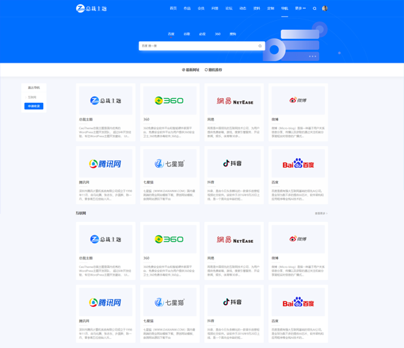 配套完整的网址导航功能,包含了网址导航首页页面、分类页面、信息内页,以及快捷搜索,同时支持用户前端提交网址信息